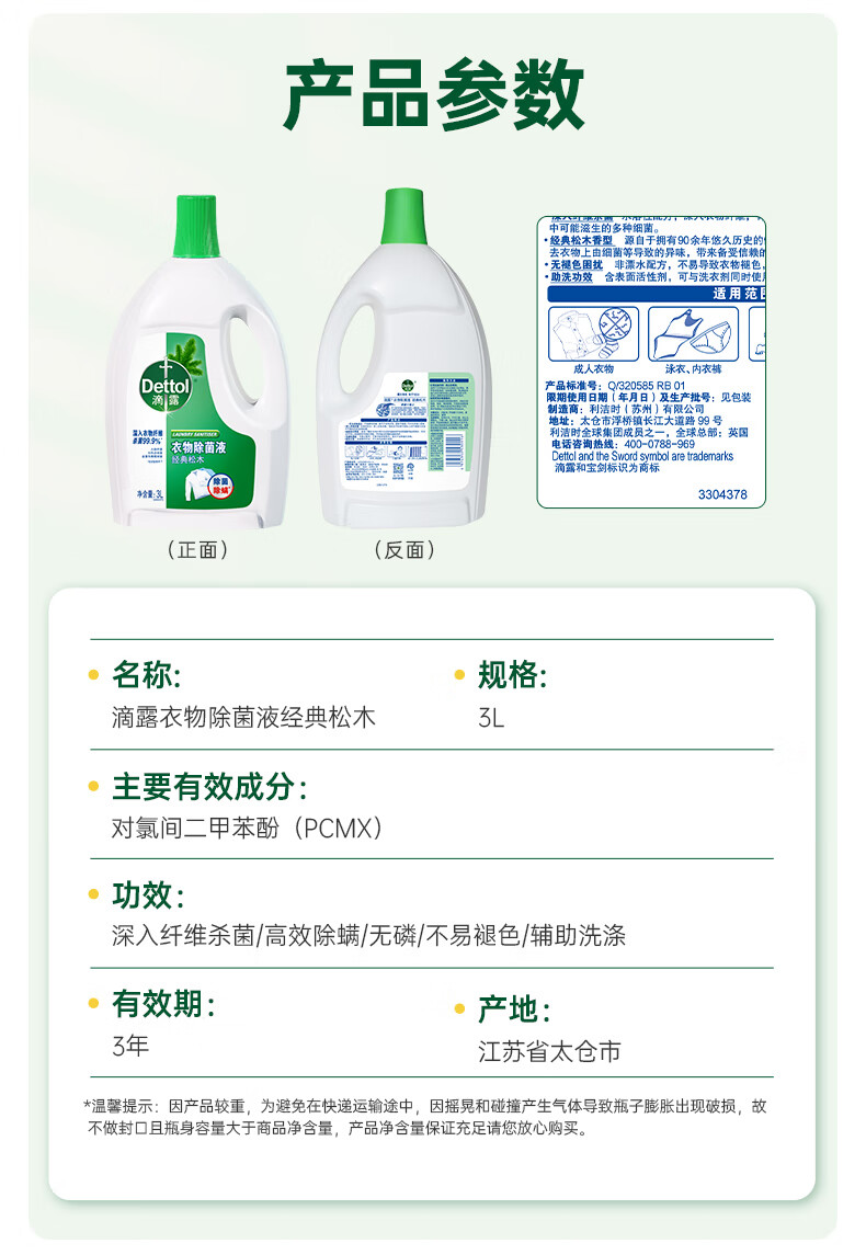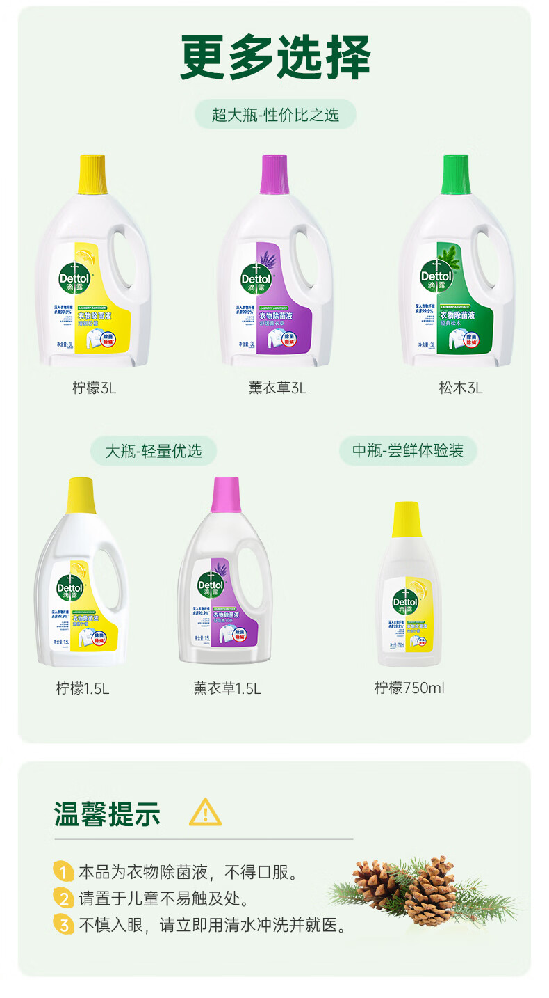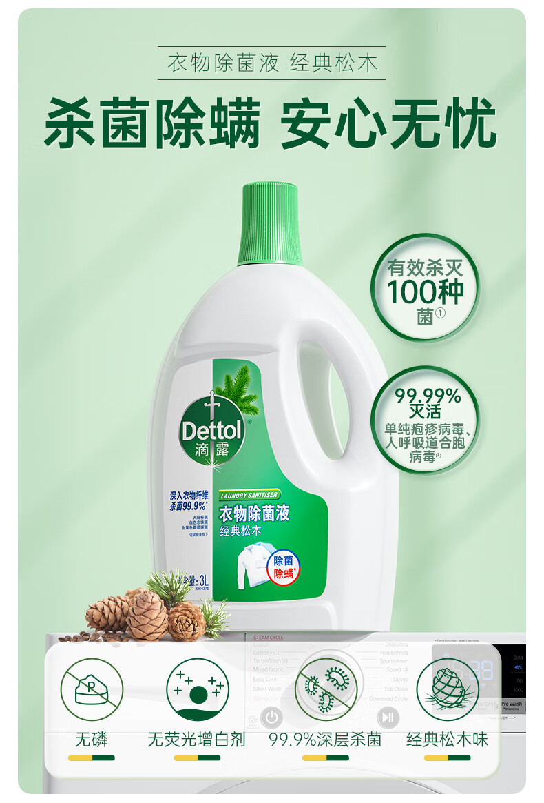 滴露(Dettol)衣物除菌液 消毒液 家庭儿童内衣裤家用清洁杀菌高效除螨水 松木除菌液3L