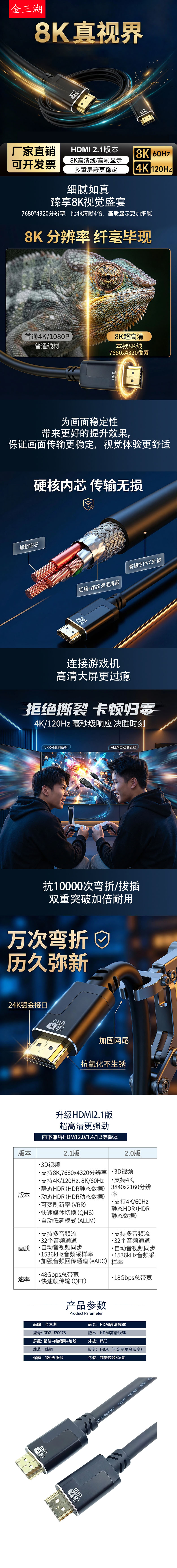 金三湖HDMI线2.1版8K60Hz 4K240Hz高清视频连接线兼容HDMI2.0笔记本电脑接电视显示器投影仪 HDMI-8K高清线 2米