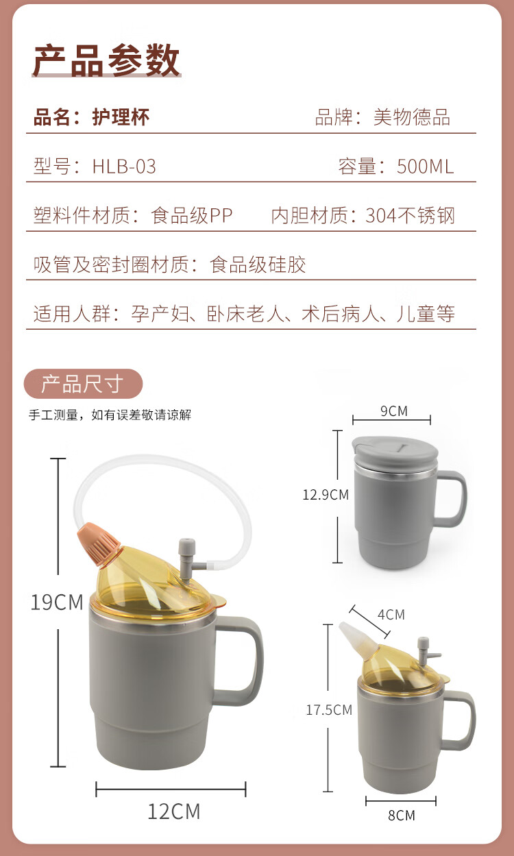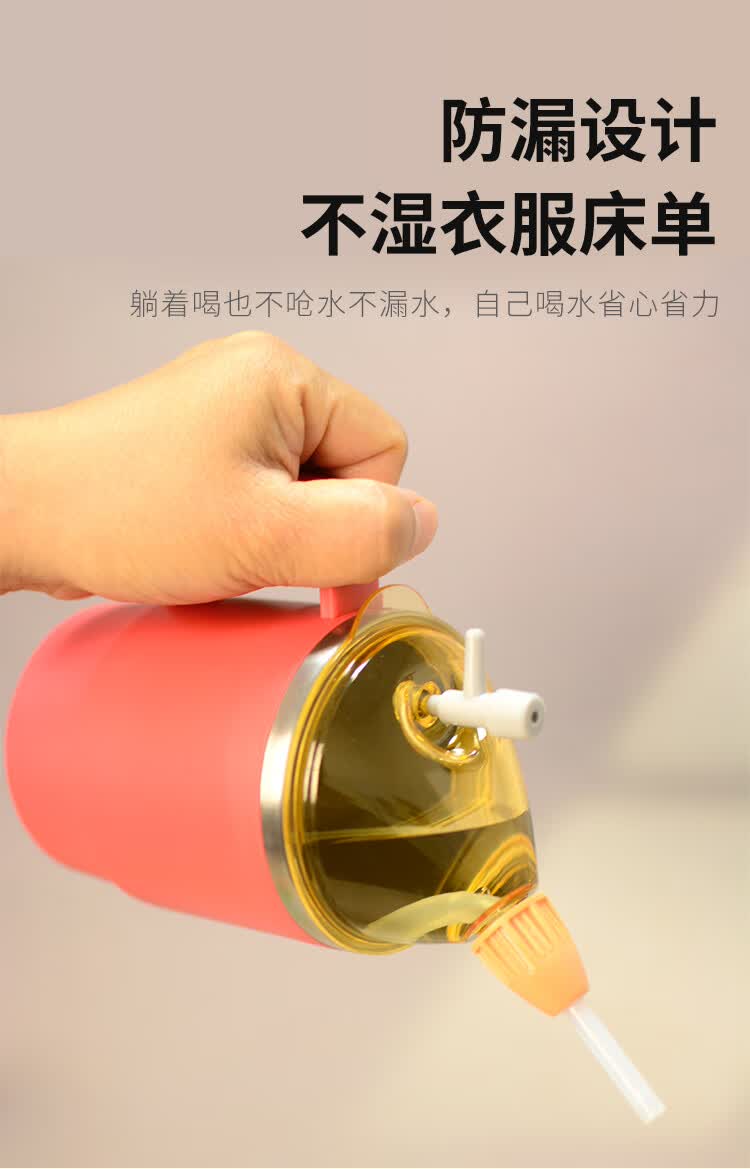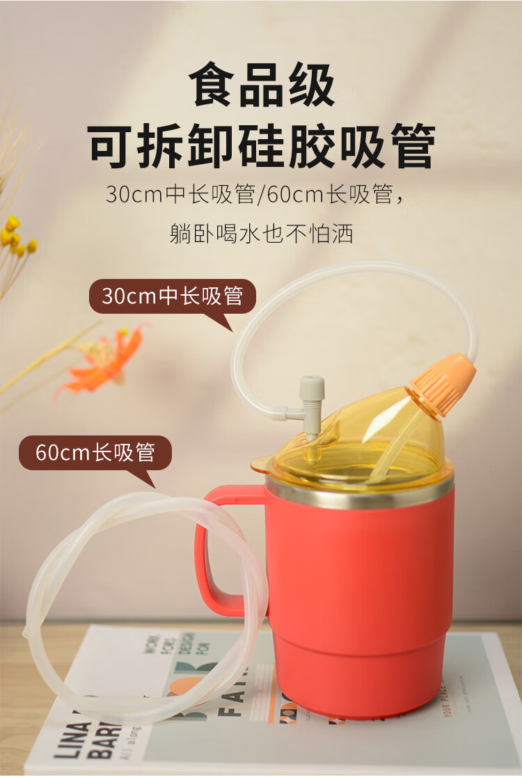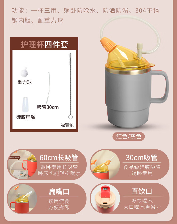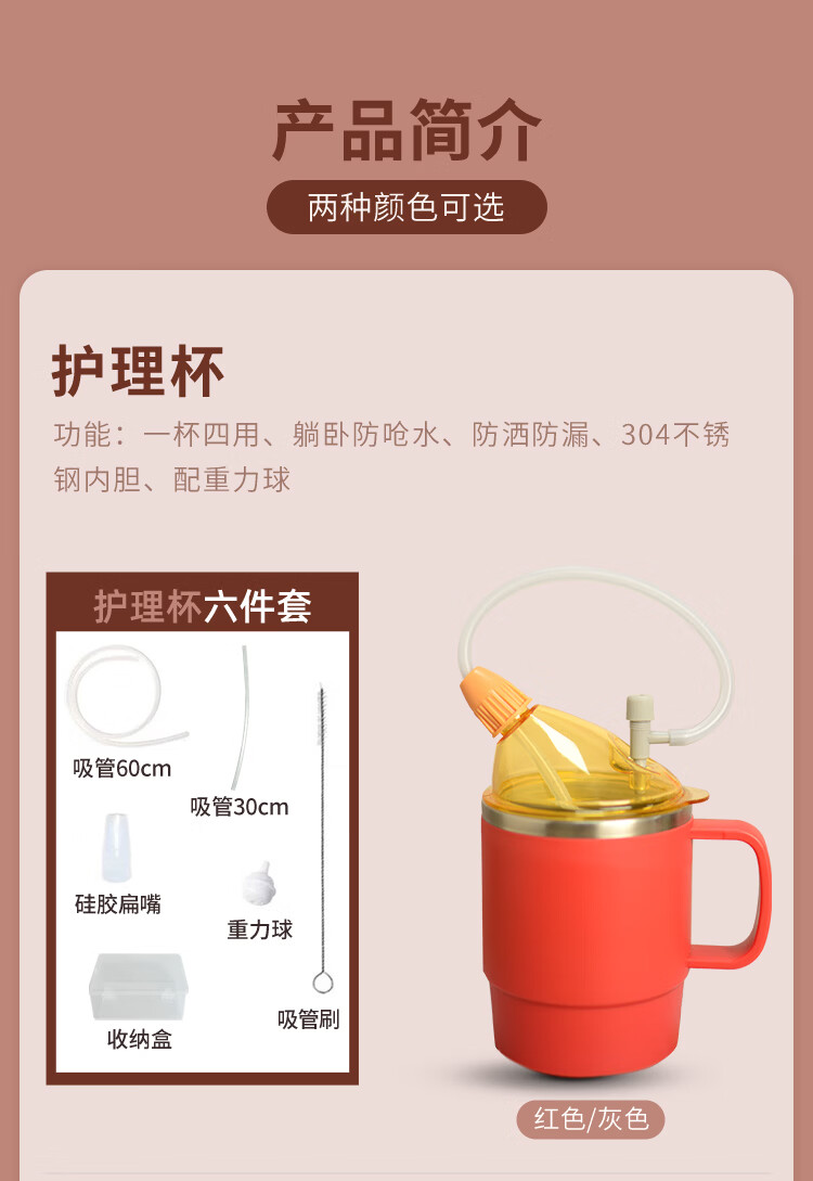 美物德品老人防呛护理杯瘫痪卧床病人喝水杯吸管喝流食孕产妇护理专用杯 护理杯六件套红色500ml