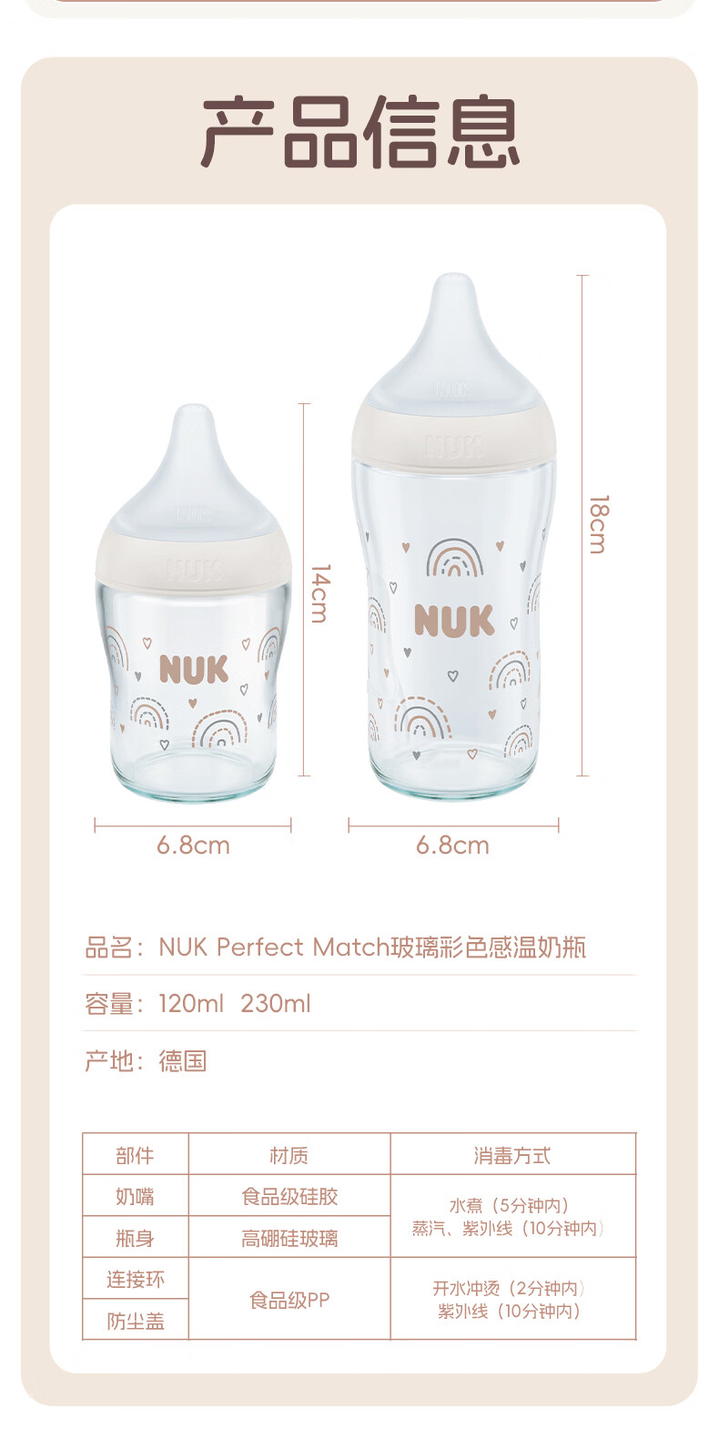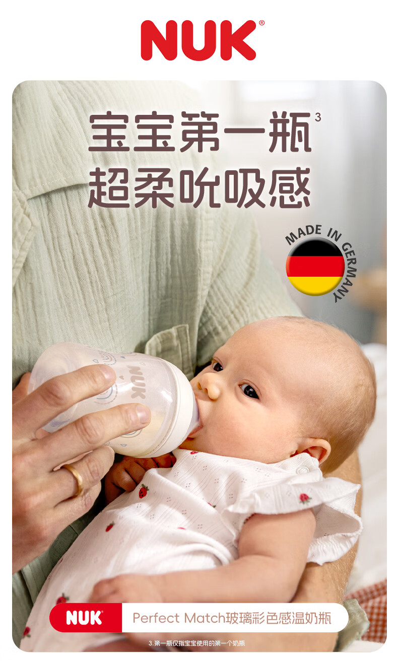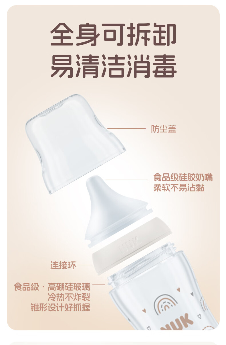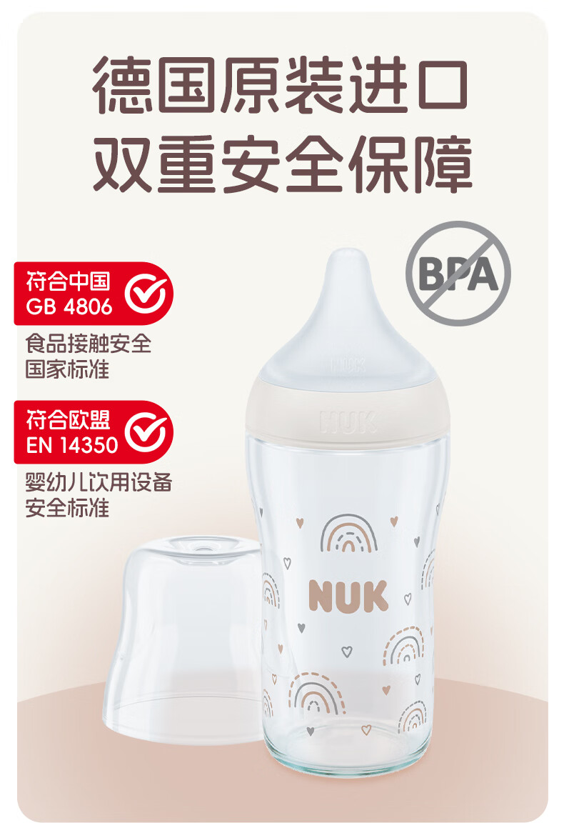 NUK德国新生婴儿宝宝玻璃奶瓶0个月以上仿真母乳奶嘴感温防胀气硅胶 白色 (0月+)S号奶嘴 120ml