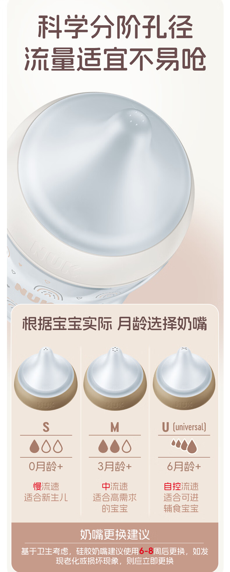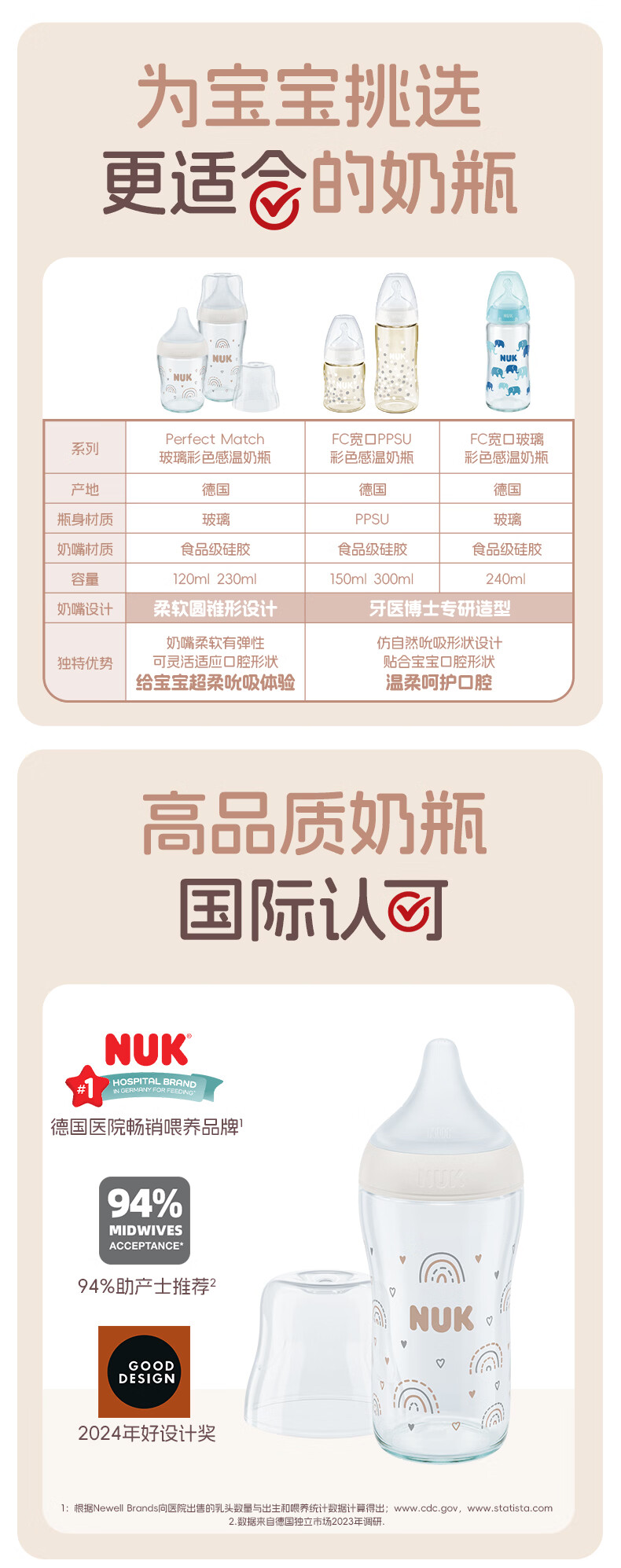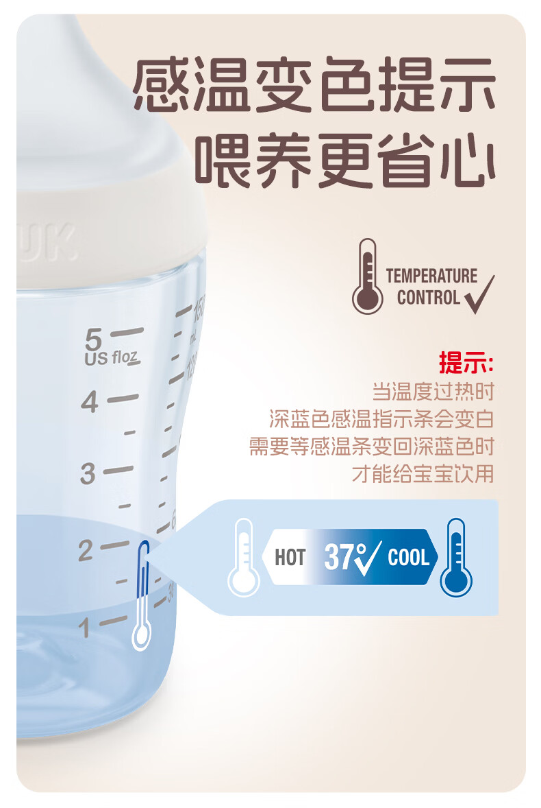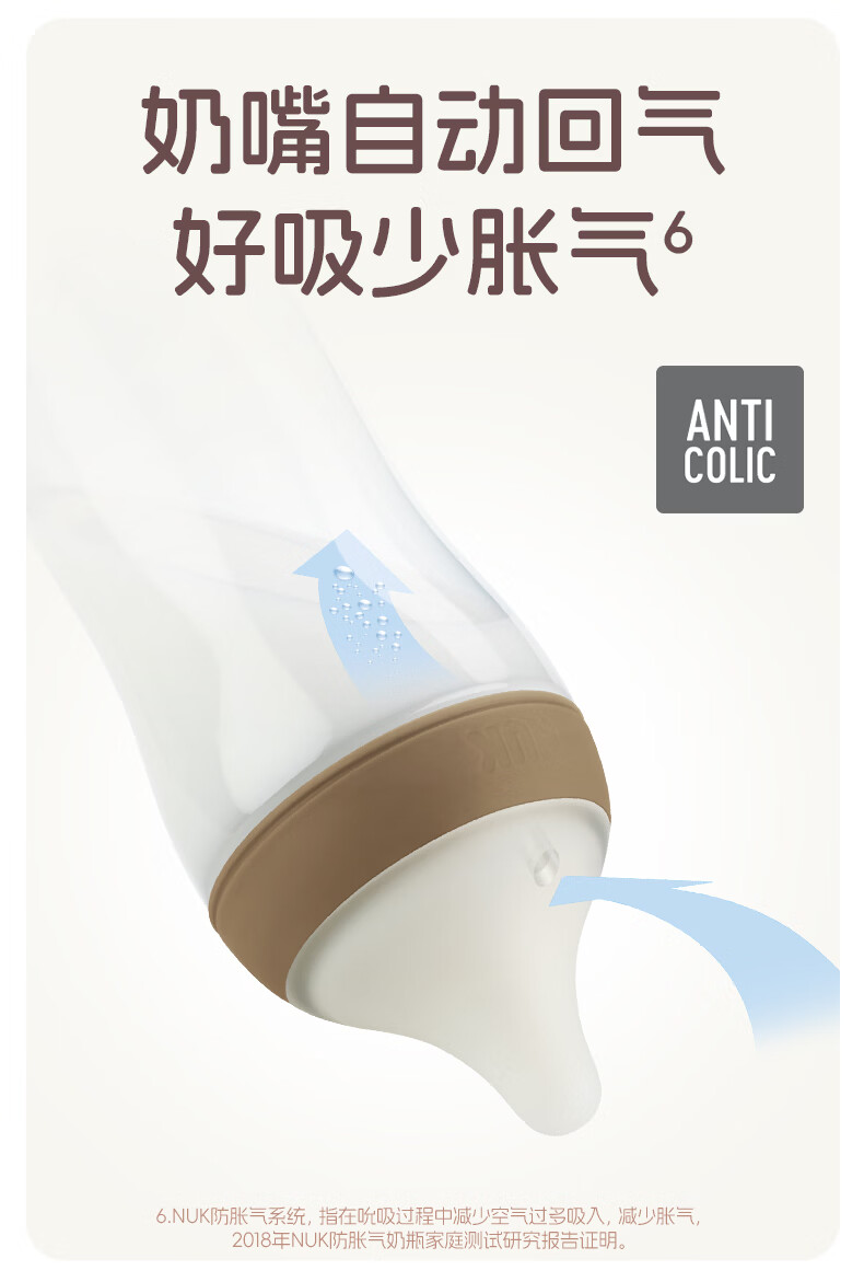 NUK德国新生婴儿宝宝玻璃奶瓶0个月以上仿真母乳奶嘴感温防胀气硅胶 白色 (0月+)S号奶嘴 120ml