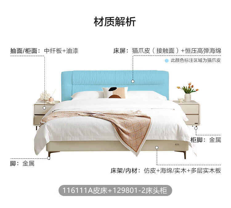全友家居线下门店同款布朗尼皮艺床软包床头靠背主卧大床床头柜U30001 【松露黑 | 高脚款】单床 2x2.2米