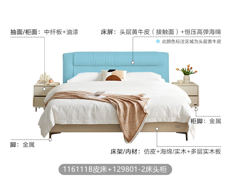 全友(QUANU)【迷瞪清仓货盘】皮艺软包床头层牛皮高脚双人床储物齐边床床垫 牛皮|单床 1.8米